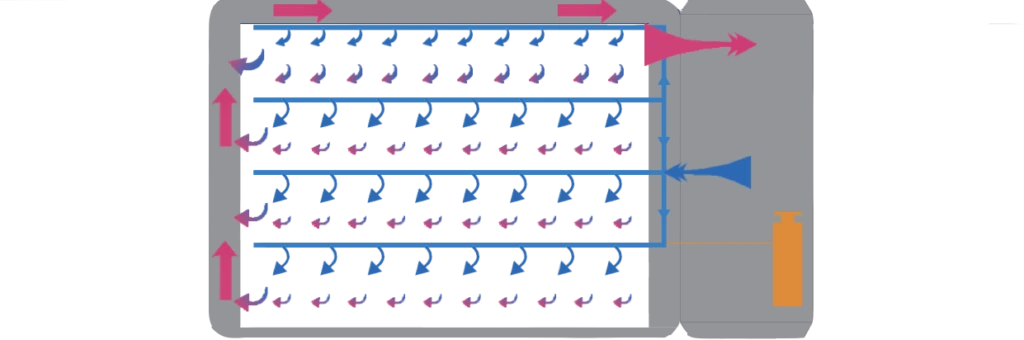 AeroFarmCube offre funzionalità avanzate di controllo del clima, consentendo una regolazione precisa della temperatura, dell’umidità e dei livelli di CO2. Il sistema fornisce aria calda e fredda secondo necessità, mantenendo un intervallo di controllo dell’umidità compreso tra 45% e 98% a 25°C. Questa completa regolazione artificiale del clima garantisce un adeguato flusso d’aria alla chioma delle piante, creando condizioni di crescita ideali tutto l’anno.